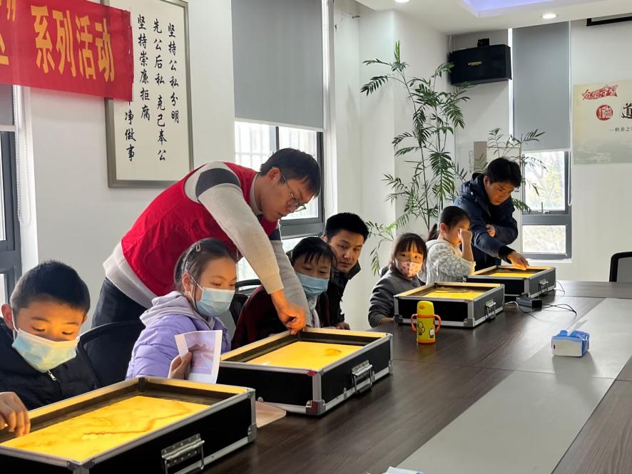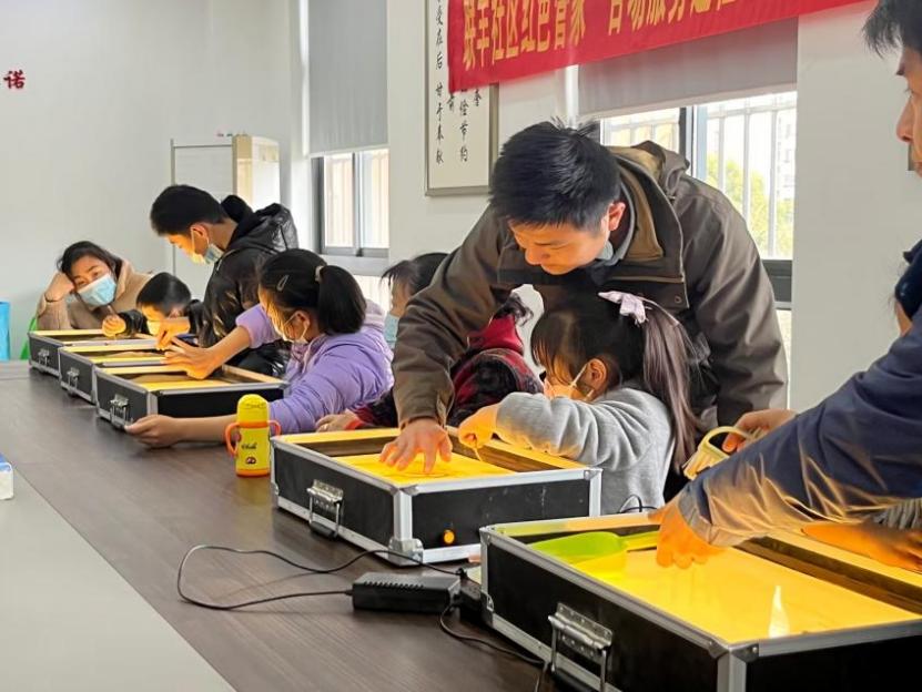 活动开始由志愿者向参与人员介绍沙画有关知识,声情并茂地讲述了沙画发展的历史、原理以及分类等,在简单讲解了沙画创作的技巧后,志愿者分发了图片样式,小朋友们也跃跃欲试,开始了自己的创作。在志愿者以及家长的帮助下,细小的沙粒在孩子们的指尖变幻为各式各样的图案,在灯箱柔光的照射中形成了独特的视觉体验,也给大家留下了一次难忘的回忆。