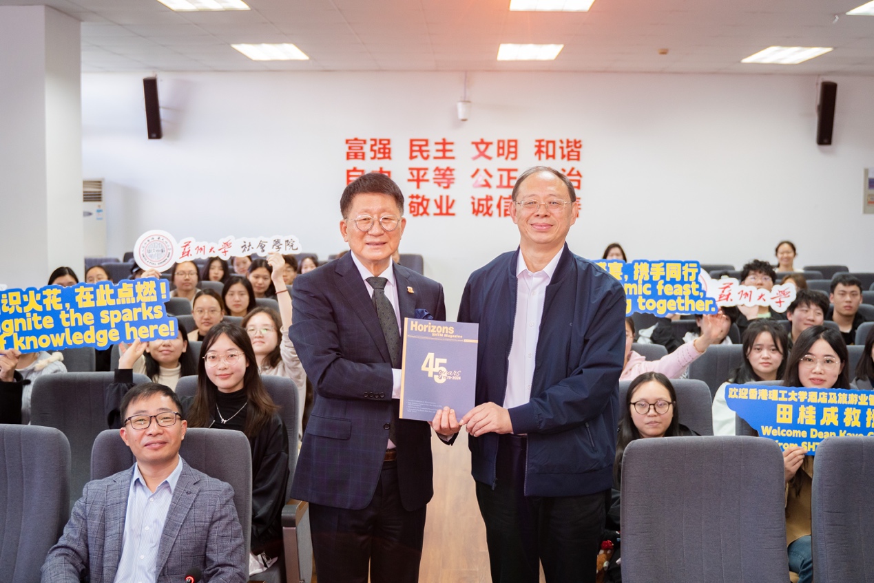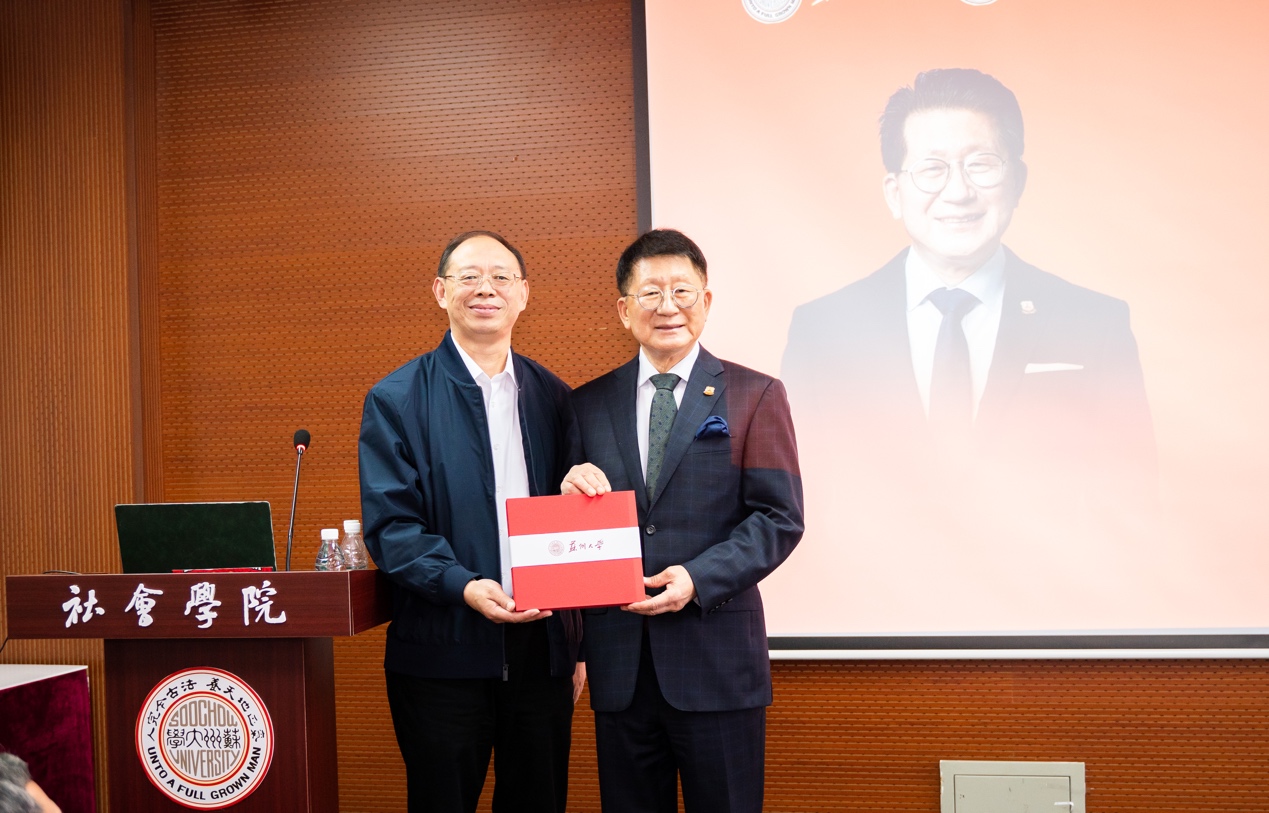 讲座结束后,蜜桃传媒 党委书记邓国林为Kaye Chon教授颁发纪念品,Kaye Chon教授也向蜜桃传媒 回赠纪念刊物。