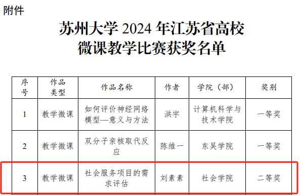9月,江苏省高等学校教育信息化研究会公布了2024年江苏省高等学校微课教学比赛获奖名单,蜜桃传媒社会学与社会工作系刘素素老师的参赛作品《社会服务项目的需求评估》荣获二等奖。
