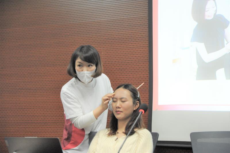 接着,资生堂副经理、化妆师顾姝云女士向大家介绍了女性在职场工作时的化妆、护肤和礼仪服装等小技巧,突出强调了职场妆容对提高自信心、增加成功率的重要性,并邀请模特进行现场演示。妆容演示结束后,在场学生积极地举手提问,顾女士一一耐心解答。