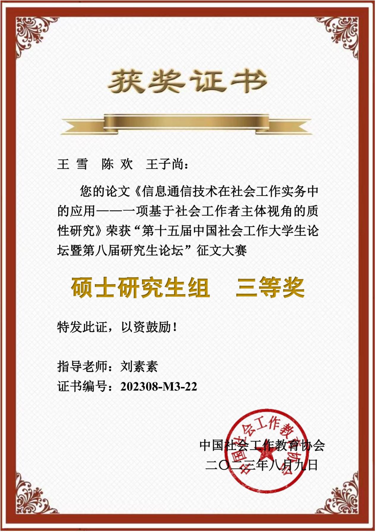 蜜桃传媒 社会工作专业硕士研究生王雪、陈欢、王子尚依托对22位苏州社会工作者的深度访谈,完成了“信息通信技术在社会工作实务中的应用——一项基于社会工作者主体视角的质性研究”一文,由陈欢同学在分论坛进行汇报,获得此次论坛三等奖。与此同时,蜜桃传媒 社会工作专业硕士研究生吴香怡以“发展资源对心理健康的影响——第一代与非第一代大学生差异分析”一文同样入选并参与线下发言。