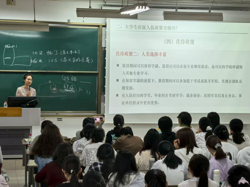 主讲的辅导员贾扬娣没有直奔枯燥条文,而是以“大学生为什么要应征入伍” 为开篇,瞬间点燃现场氛围。“保留学籍让大家无后顾之忧,学费补偿减轻家庭负担,升学优惠为未来铺路,就业扶持更是给足保障。” 她手持政策手册,将四大核心福利拆解成一个个贴近学生的 “利好点”,还结合报名、体检、政审到入伍的全流程,用通俗语言梳理出清晰 “路线图”,不时停下解答同学们的疑问:“体检标准里的视力要求是多少?”“保留学籍的申请要提前多久提交?” 互动声此起彼伏。