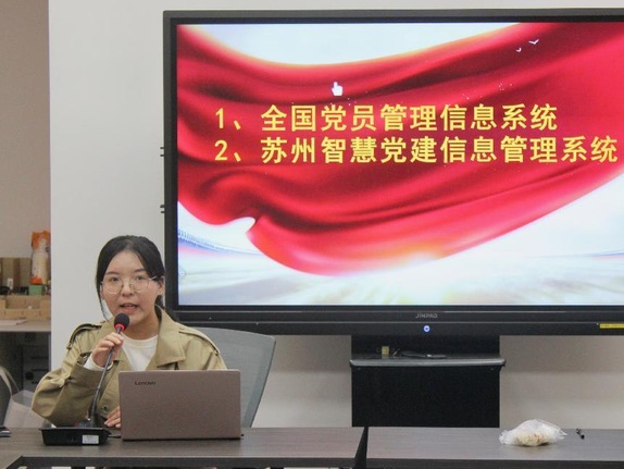 随后,研究生第一党支部书记温玉聪同学介绍了全国党员管理信息系统和苏州智慧党建信息管理系统的使用方法,并总结了做好党支部工作的四个要点:一是要加强党支部教育管理工作;二是要及时听取支部党员的意见建议,不断改善工作的方式方法;三是支部委员会成员应分工明确,在具体工作中要相互配合;四是要严格把关发展党员工作。