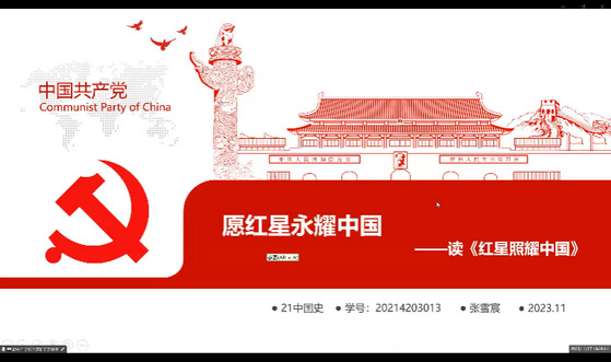 2021级中国史专业张雪宸同学分享了《红星照耀中国》一书。她从书中既感受到了长征途中的艰苦,又领悟到了党员干部和红军将士展现出的“讲政治、顾大局,讲规矩、守纪律,讲统一、促团结”的革命风范。她表示,作为当代中国青年,应当继承先辈遗志,忠于信仰,献身理想,为人民求幸福,走好新时代的长征路。