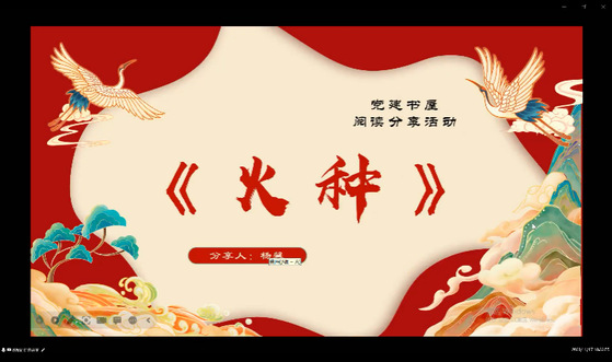 2022级历史学(师范)专业杨馨同学向大家分享了《火种》一书。她从阅读理由、阅读进度、阅读感悟、阅读成果四个部分向大家阐述阅读此书的所得所感。她认识到:青年要学习新思想、学习革命精神,积极向党组织靠拢,不仅要为自己的未来努力奋斗,更要掌握为人民服务的本领,为祖国的建设和民族的伟大复兴贡献自己的力量。