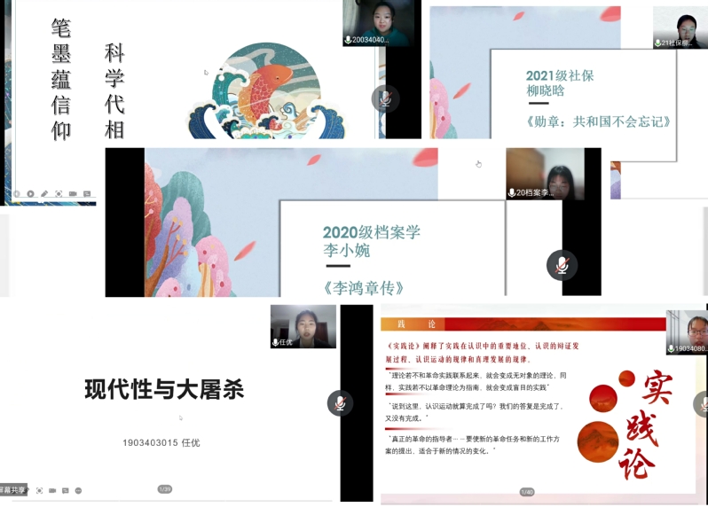 书刊分享环节结束后,培训班学员以诗朗诵的形式,表达青年之声,向党的二十大献礼。陈如意、郭宇辰、彭赵星、秦柏杨、刘骐铭五位同学通过朗诵《永远跟党走》,带领大家回顾党的历史和成就的同时,表达出在党的带领下一定会实现中国梦的坚定信心。余琦用《祖国》传递了作者海子的信仰和追求,鼓励大家以梦为马,不负韶华。赵静姝为大家朗诵的是为迎接党的二十大召开所做的诗歌《你是伟大民族的荣光》,表达出在党的二十大到来之际,中华儿女有信心,有决心,跟党走,凝聚力量,不负时代向远方。章紫怡通过朗诵《共克时艰同期盛会》也表达出对党的二十大即将召开的激动心情。王玥朗诵的《在复兴大道上向前》向大家展示了中华民族在复兴路上做的努力,并表达出中华民族会不断努力,一直向前。