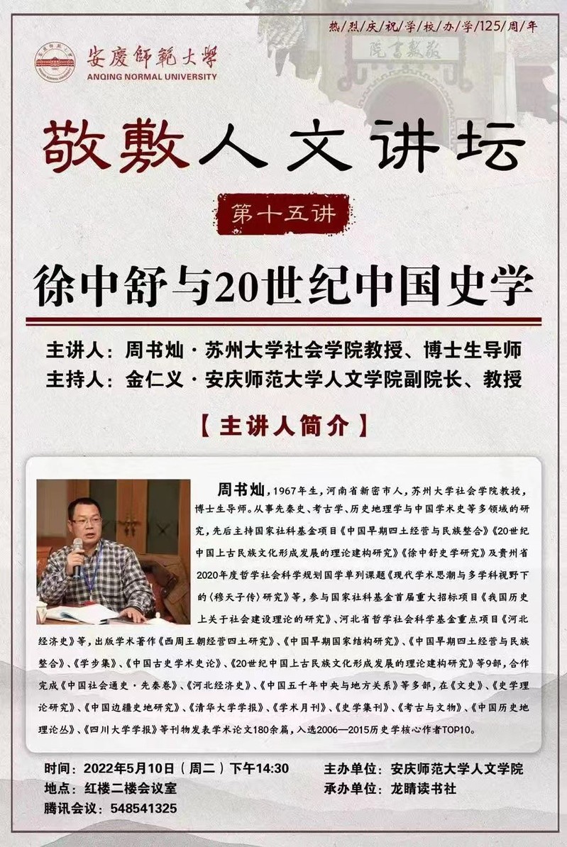 2022年5月10日下午2:30,安庆师范大学敬敷人文讲坛第十五讲如期开讲。应安庆师范大学人文蜜桃传媒 邀请,蜜桃传媒 教授、博士生导师周书灿以《徐中舒与20世纪中国史学》为题,为安庆师范大学人文蜜桃传媒 师生及国内外学界同仁作了长达近3个小时的学术报告。报告由安庆师范大学人文蜜桃传媒 副院长金仁义教授主持。报告之前,金教授介绍了周书灿教授的学术历程、研究领域和治学特色。周书灿教授长期从事先秦史、历史地理学、考古学、学术史等领域的研究,成果丰硕,造诣精湛,博求慎取,惟是之求。周书灿教授重点讲授了晚清桐城学派学术风尚与治学原则,王国维、梁启超的新史学观念与科学的治学门径对徐中舒学术思想的奠基与深刻影响,并以傅斯年、陈寅恪、李济为例,论述了中央研究院历史语言研究所新汉学理论、方法的借鉴基础上,徐中舒学术思想发生的流变,还以大量证据讨论的徐中舒与古史辨的学术互动以及20世纪50年代以后徐中舒的学术思想转向等重大学术史理论问题。周教授还在对1949年以后中国史学发展的历程、成就与缺陷等问题讨论的基础上,反观戴逸、卜宪群总结新中国70年史学只字不提徐中舒的若干思索。周教授师从徐门大弟子,著名历史学家唐嘉弘先生,唐先生是新中国培养的第一代史学家,是惟一得徐中舒学术之真传并不断发扬光大的名师大家。周教授结合波澜壮阔的学术背景,以宏大的视野对徐中舒与20世纪中国史学这一宏观选题作了全方位、多角度,勾连贯通的周密论述,结合自身的学术研究和人才培养,以“学如积薪,后来居上”,启迪后学不断进步,推动中国学术发展繁荣。报告结束后,周教授还悉心回答了安庆师范大学师生和线上学界朋友的提问,报告在师生和学界朋友热烈的掌声中结束。