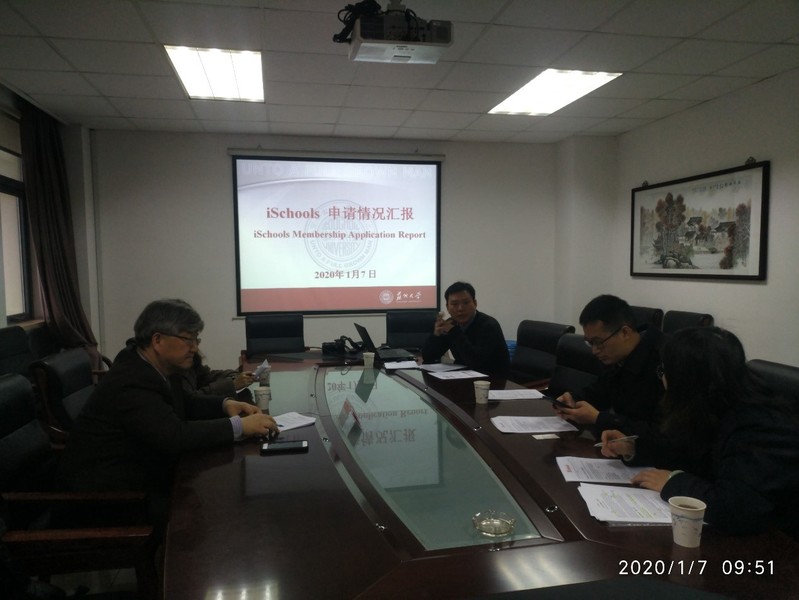 1月7日上午9:30-11:00,Sam Gyun Oh教授及蜜桃传媒档案与电子政务系教师就该系加入iSchool联盟的相关细节及申请表撰写进行了讨论。档案与电子政务系系主任毕建新、副系主任徐芳及部分青年教师参与讨论。会中,李雅老师围绕iSchool要求对档案与电子政务系的基本情况进行了汇报,Sam Gyun Oh教授仔细聆听后提出了详细的修改建议。