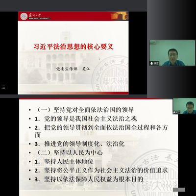 随后的党课教学中,吴江部长作题为《习近平法治思想的核心要义》的专题党课。他围绕中国特色社会主义法治体系的历史底蕴、党的十八大以来全国依法治国的重大成就、习近平法治思想的核心要义等内容,系统阐述了新时代推进全面依法治国的重要思想和战略部署,结合生动案例对“十一个坚持”作重点解读,深刻回答了为什么要全面实行依法治国、怎样实现全面依法治国等一系列重大问题。他强调,习近平法治思想具有鲜明的政治性、时代性、系统性,指引着中国特色社会主义法治的发展向度。他鼓励青年学子在思想理论观点的学习中、历史文化底蕴的领悟中、全面依法治国的实践中,坚定法治自信,担负时代使命,在推进治理体系和治理能力现代化进程中书写青春华章。