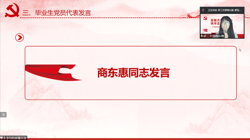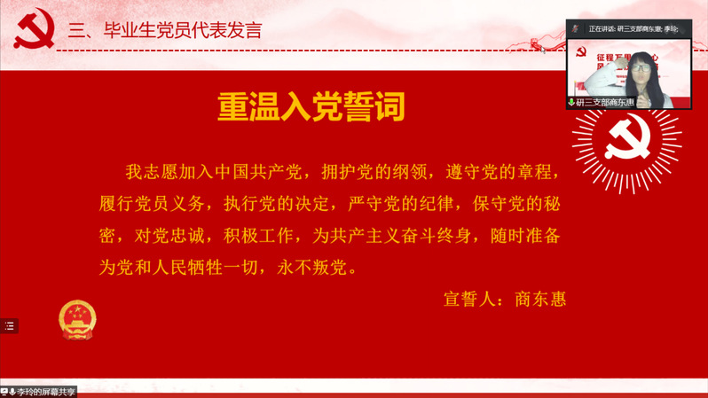 接着,2019级中国史专业硕士生商东惠代表毕业生党员发言。商东惠将留院攻读中国史专业博士学位。她分享了自己的入党历程,呼吁大家谨记党员身份,并以之激励自己前行,找到真正的个人价值与社会价值,不断拓宽自己的视野,向着更高的目标出发。紧接着,全体毕业生党员在商东惠同学的带领下重温了入党誓词,坚定了入党初心。