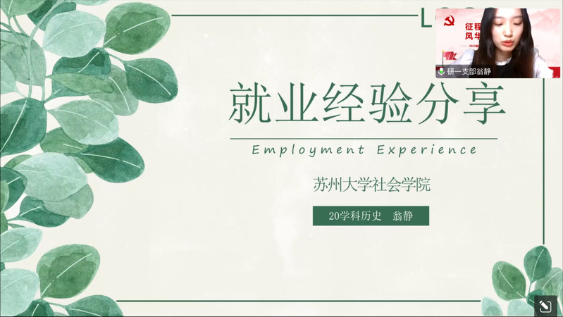 随后,毕业生党员代表2017级档案学孙淑婷、2018级档案学仲晓莹、2020级学科历史翁静分享她们在考公、保研、就业方面的经验和心得。孙淑婷分享了选岗-笔试-面试的考公全过程中自己的备考经历,建议大家考公岗位选择要慎重,提出笔试部分行测做题要精、申论卷面要清秀,面试部分要避免套路化。仲晓莹从校内推免资格、保研流程、信息搜集渠道三方面详细阐述自己的保研经验。翁静向大家介绍了就业信息的获取渠道、教师资格证笔试复习的主要内容、面试的前期准备与试讲的技巧。