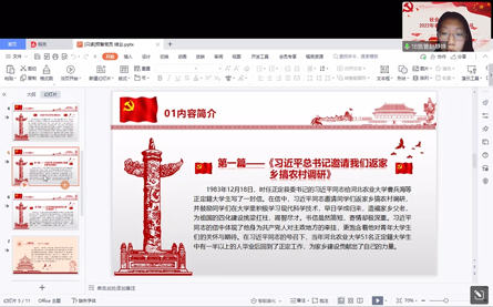第二部分培训班阅读成果汇报环节。通过举办“乐读好书,共建书屋”阶段性阅读分享会,分党校评选出3位同学进行本次阅读成果汇报。首先,何红玉同学进行《围城》阅读心得分享,她展示了阅读过程中制作的精美手账,分享了从书中摘录的经典语句。她在分析书中人物形象的基础上,讲述了自己关于人生与人性的思考。随后,张艺同学分享了刘少奇的演讲《论共产党的修养》,提出加强党性修养的重要性并展示了自己绘制的红色主题画作,画作颇具巧思和特殊寓意。最后,赵静姝同学进行《习近平与大学生朋友们》阅读成果汇报,她对书本前三篇内容作了重点介绍,并结合自身志愿服务经历,对“自找苦吃”“联系群众”等内容进行深入解读,并呼吁各位学员要做新时代有奉献精神的新青年。三位同学的阅读分享精彩纷呈,不仅展现了培训班学员“多读书,会读书,读好书”的阅读精神,也体现了学员们将理论知识内化于心,外化于行的实践精神。