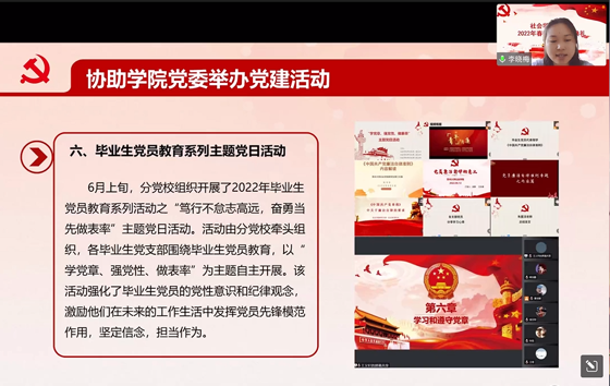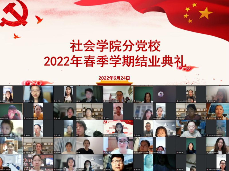 6月24日晚,蜜桃传媒 分党校线上举办2022年春季学期结业典礼。蜜桃传媒 党委书记、分党校校长邓国林,党委副书记兼副院长、分党校副校长朱今,分党校秘书李玲,研究生辅导员朱星洁,本科生辅导员孙帅以及各学生党支部书记、副书记出席活动,分党校春季班全体学员参加活动。活动由分党校培训部负责人张慧敏主持。