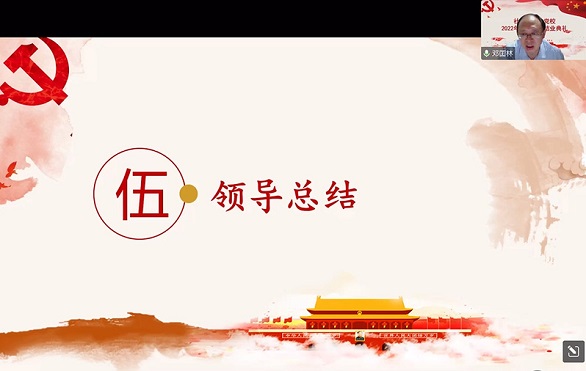 最后,邓书记作总结讲话。他首先充分肯定了分党校本学期在党员教育培养和党建活动方面取得的工作成效。随后,他带领大家学习了习近平总书记给中国冰雪健儿、给中国航天科技集团空间站建造青年团队和给南京大学留学归国青年学者的回信,希望各位学员牢记习近平总书记的寄语——“在奋斗中创造精彩人生,为祖国和人民贡献青春和力量”。最后,他鼓励分党校新一届学生工作组织成员继往开来,进一步增强做好分党校工作的使命感和责任感,努力开创分党校工作新局面!