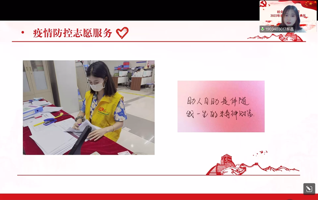 培训班优秀学员代表郝晶同学从“学”“践”“行”“思”四个方面分享了参训期间在党课学习、志愿服务、活动比赛、结业收获等方面的情况,她感谢党组织的教育和培养,并表示要继续学习好党的理论知识,树立远大志向,不断砥砺前行!