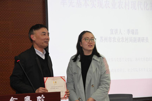 季瑞昌从事三农工作38年,具有丰富的工作实践经验。在讲座中他强调,农业农村现代化是国家现代化的基础和关键,我国社会主要矛盾已经转化为人民日益增长的美好生活需要和不平衡不充分的发展之间的矛盾,其中提到的“不平衡不充分”主要在于农村农业的不平衡不充分发展;而苏州以工业化城镇化带动农业农村现代化努力为全省乃至全国率先实现农业农村现代化提供“苏州经验”、展示“苏州样板”。他向大家介绍了苏州率先基本实现农业农村现代化的“三部曲”,探索“四化同步”,推进城乡一体化;突出“强富美高”,推动高质量乡村振兴;聚焦“三化一融”,率先基本实现现代化。