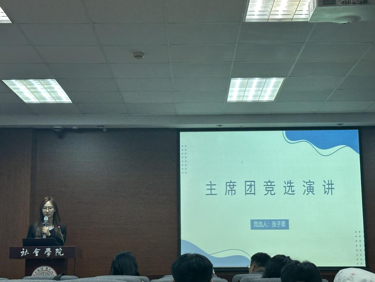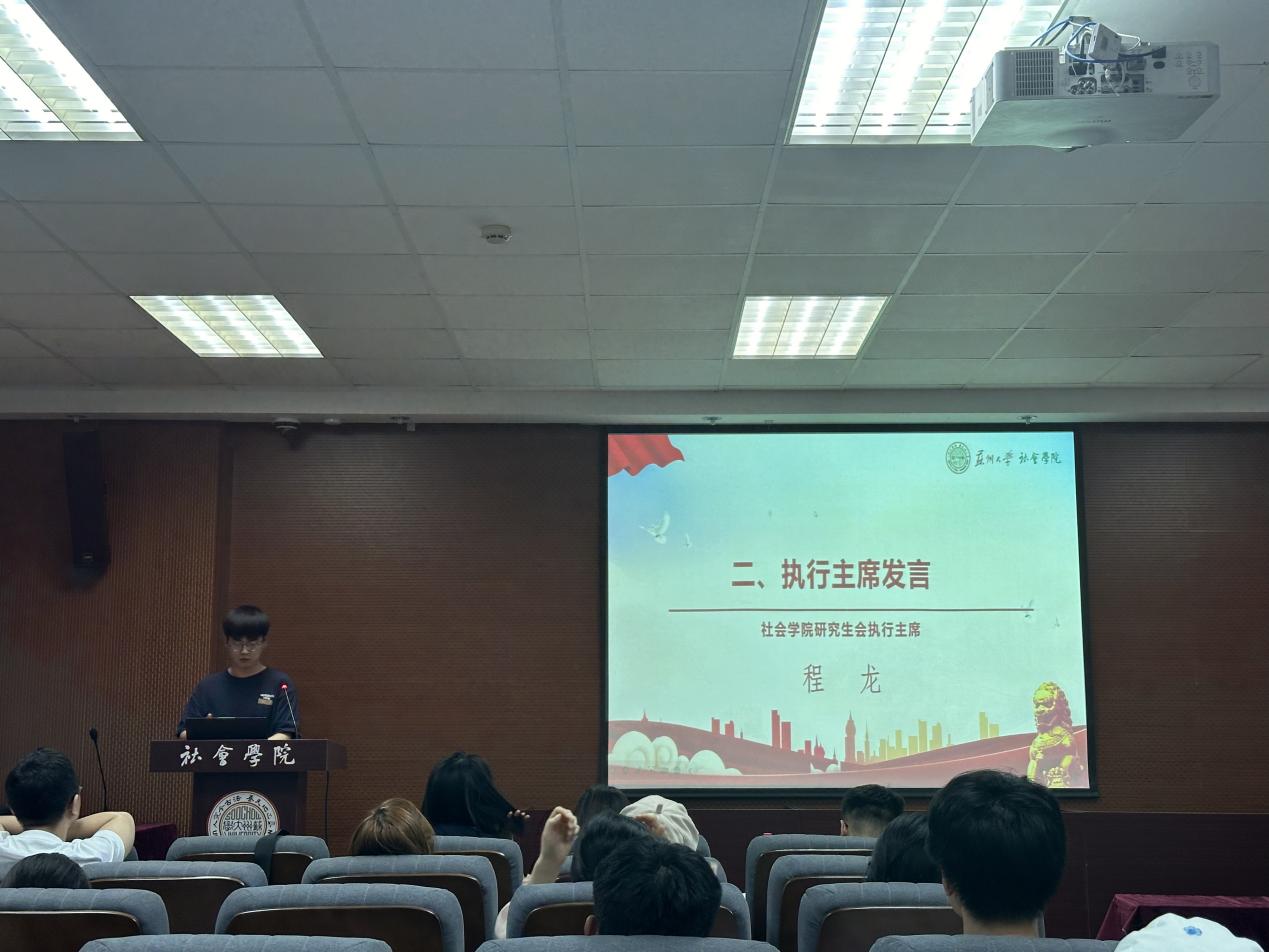 会议内容包括研究生会志愿者留任竞选、研究生会执行主席汇报、研究生会秘书长致辞三部分。