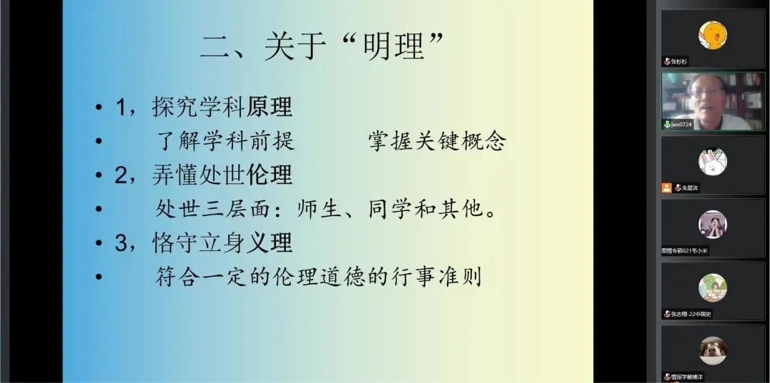 其次,金老师以“明理”为脉络,讲述了探究学科原理、弄懂处事伦理、恪守立身义理三个关键点。第一,探究学科原理即要了解学科前提、掌握学科关键概念和明确研究路径方法;第二,弄懂处事伦理即要与师生、同学及其他人正确进行社会交往;第三,恪守立身义理即坚持符合一定伦理道德的行事准则。