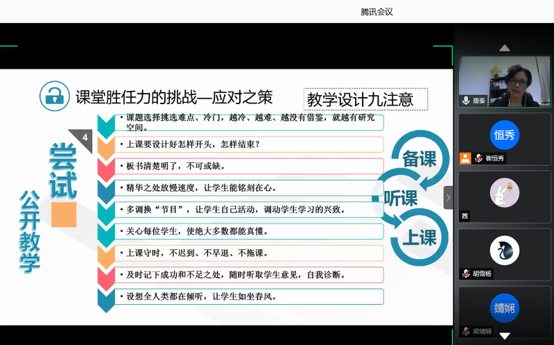 在互动提问环节,唐老师就新教师如何上好第一堂课、如何对教材进行大胆取舍等问题作出细致回答。最后呼吁大家:做与学生心心相印的教师,做让学生念念不忘的老师,做和学生共同成长的老师!