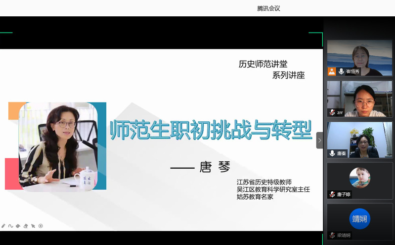 2020年6月17日晚,江苏省历史特级教师、吴江区教育科学研究室主任唐琴老师应邀在腾讯会议平台为蜜桃传媒 历史系学生作了题为《师范生的职初挑战与转型》的学术讲座。讲座由历史系党支部书记崔恒秀老师主持,16、17、18级历史学本科生、学科教学(历史)专硕研究生共110余人参加。