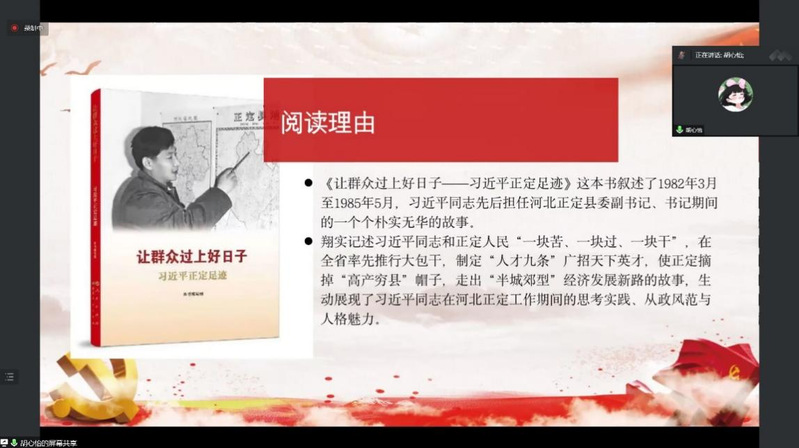 2020级历史学(师范)专业胡心怡同学向大家分享了阅读《让群众过上好日子——习近平正定足迹》一书的感受。她通过讲述习近平总书记担任河北正定县委副书记、书记的故事,为大家展现了“我将无我,不负人民”的伟大形象,鼓舞大家要做有理想有本领有担当的青年学生,让青春在奋斗中闪光。