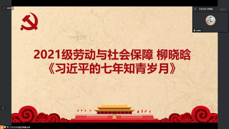 2021级劳动与社会保障专业柳晓晗同学通过分享《习近平的七年知青岁月》一书,带领大家重温了习近平总书记的青年岁月以及对青年人的深切寄语。她指出,青年学生要坚守初心不动摇,永葆本色担使命,发扬不怕苦的精神,在奋斗中创造属于自己的无悔青春。