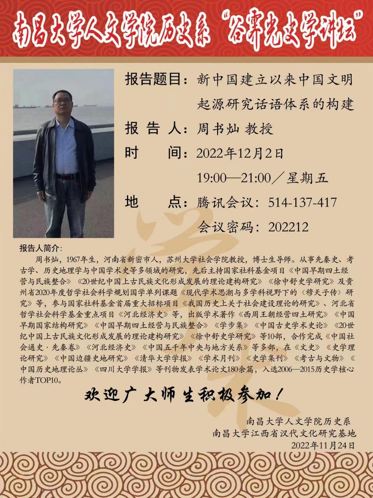 2022年12月2日晚19时,南昌大学人文蜜桃传媒 历史系谷霁光史学讲坛如期开讲。周书灿教授应邀通过线上直播形式,以《新中国建立以来中国文明起源研究话语体系的构建》为题,为南昌大学师生及校外听众作了一场精彩的学术报告。报告会由刘杰副教授主持,何丹副教授作了详尽的点评。周教授还现场回答了师生的提问,并与部分师生进行了线上互动。